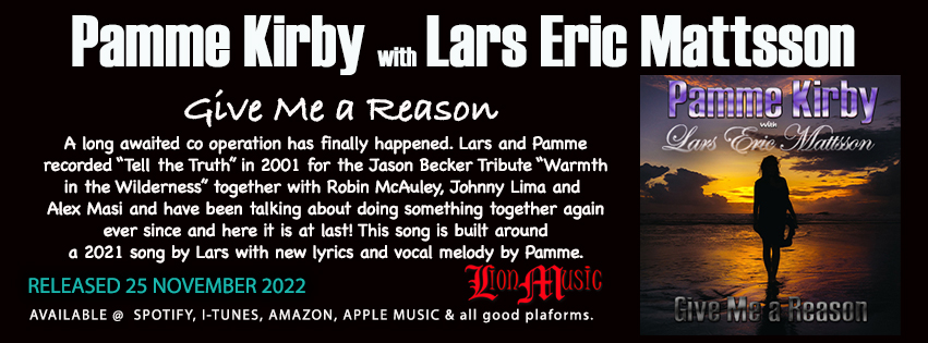 Some things take longer than expected. 21 years ago (2001) Lars Eric Mattsson recorded a version of Dave Lee Roth’s ”Tell the Truth” for the Jason Becker Tribute “Warmth in the Wilderness” with the amazing Pamme Kirby (Haven) on vocals, the song also features Robin McAuley (MIchael Schenker) Johnny Lima as well as a blistering outro solo by Alex Masi. Pamme and Lars have been talking about doing something together again more or less all through these twentyone years but now we finally seem to have something cooking. Better late than never! Look out for their single "Give me a Reason" on November 25. This song is built around something Lars did last for his album "The Outsider" but with new lyrics and vocal melodies by Pamme.